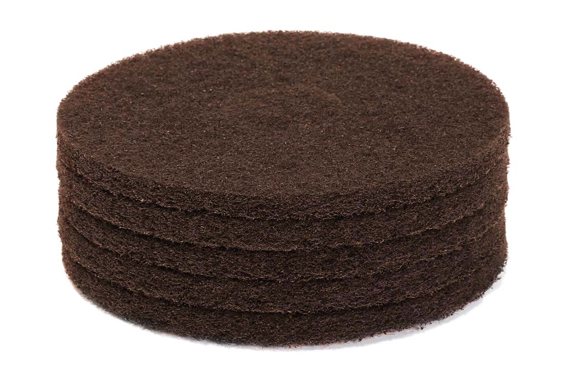 Braune Pads sind ihrem Härtegrad zwischen Schwarz und Grün einzuordnen. Damit können sie in der Unterhaltsreinigung zur Nassreinigung eingesetzt werden. Gegenüber schwarzen Pads ist die Schleifwirkung deutlich reduziert, so dass sich die braunen Pads einerseits für die Reinigung herkömmlicher PVC- und Kunstharzböden eignen, sie andererseits aber auch auf Holz-, Parkett- und Korkböden eingesetzt werden können.