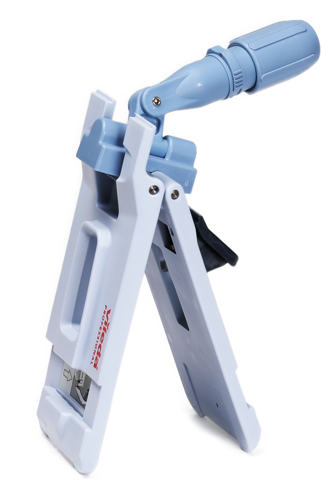 Der flach geformte Klappmophalter besitzt ein extra großes Fußpedal, mit dem man, selbst mit Sicherheitsschuhen, den Halter entriegeln kann.