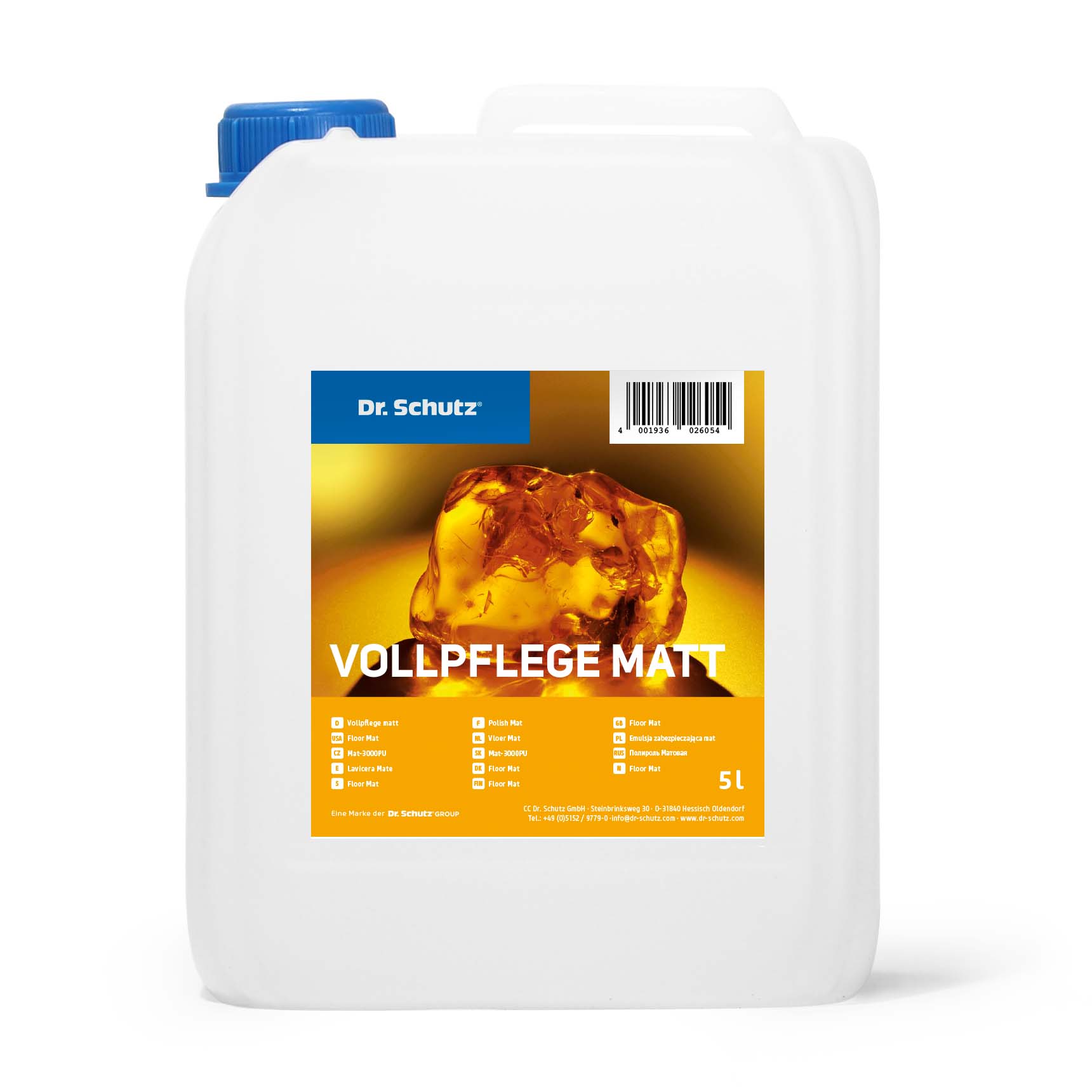 Bei der Dr. Schutz Vollpflege matt handelt es sich um eine polyurethanhaltige Polymerdispersion für die Einpflege elastischer Bodenbeläge und sollte immer dann zum Einsatz kommen, wenn die Verwendung einer Hartversiegelung oder eines PU Siegels nicht möglich oder nicht erwünscht ist. Daneben eignet sich die Vollpflege matt sehr gut für die Auffrischung PU-vergüteter Böden wie auch die Unterhaltsreinigung und Pflege elastischer Böden im Haushalt. Das Produkt sorgt dabei für einen optisch matten, rutschhemmenden Pflegefilm.
