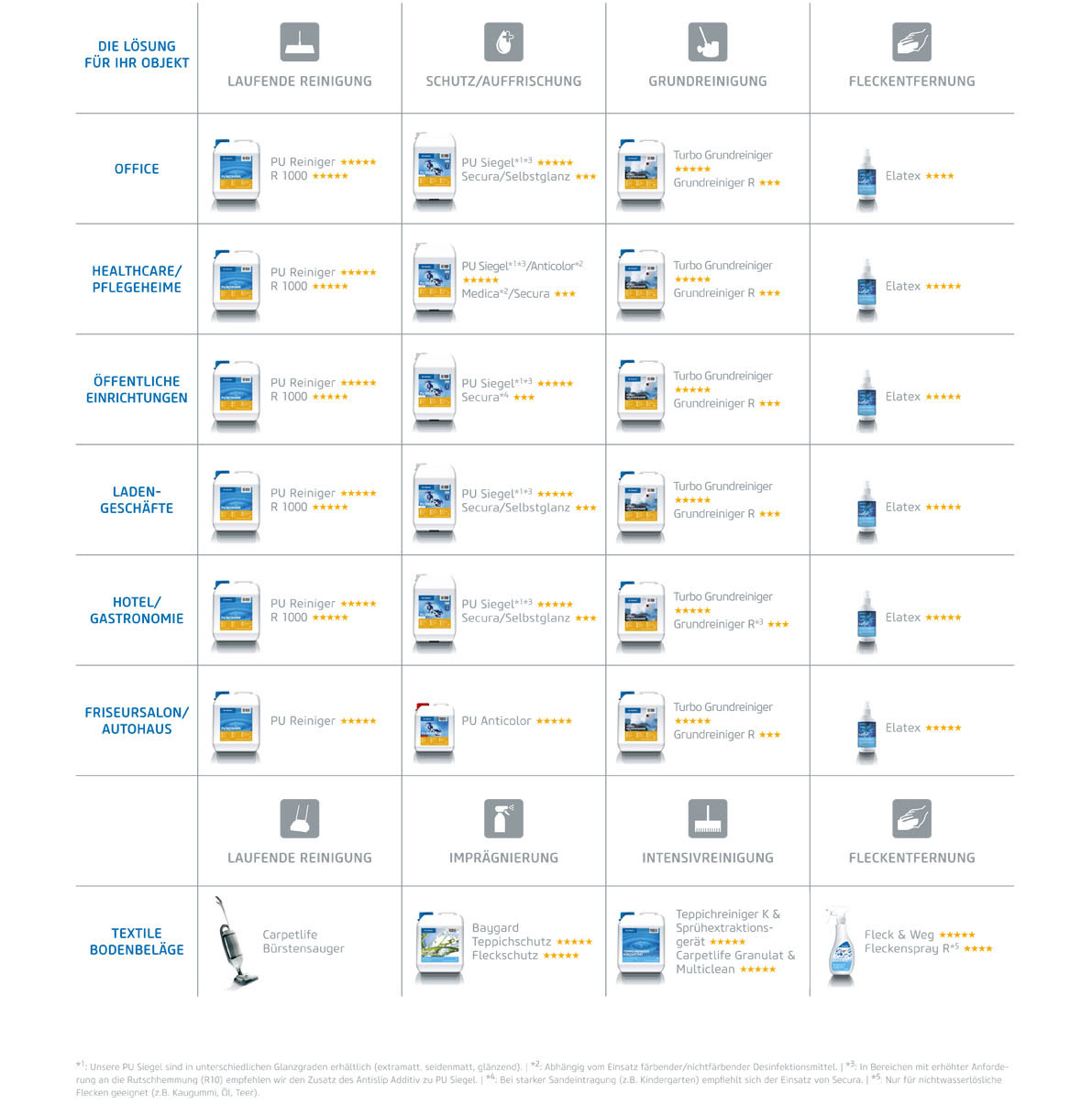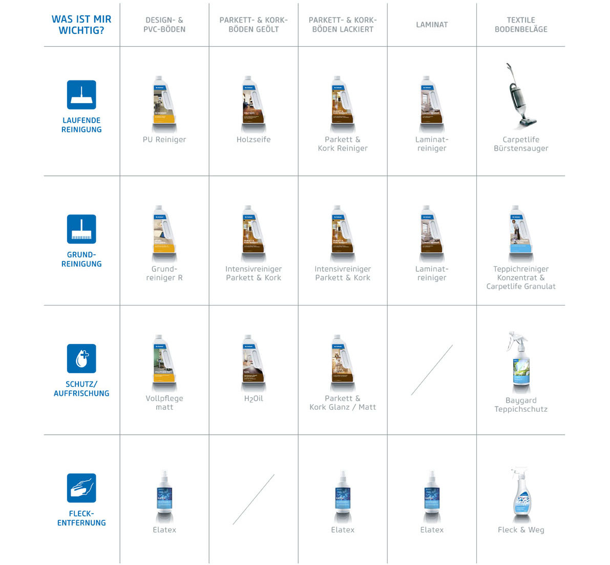 Das kann unter Umständen gar nicht so einfach sein: nicht jeder weiß, ob das eigene Parkett nun geölt oder doch lackiert ist, ob der heimische Teppichboden aus Natur- oder Synthetikfasern besteht - was aber bei der Auswahl der richtigen Pflegesubstanzen und Reinigungsmittel von großer Bedeutung ist. Fußböden sind traditionell stark beanspruchte Flächen und benötigen regelmäßige Fußbodenpflege und besonderen Schutz. Von daher ist es entscheidend, bei der Produktauswahl nicht danebenzugreifen: Schritt 1 ist also immer, über das eigene Material Bescheid zu wissen. Mit diesem Hintergrund können Sie dann daran gehen, die entsprechenden Produkte auszuwählen. Dazu können Sie sich an die unten abgebildete Matrix halten, die dem entsprechenden Verwendungszweck das passende Produkt zuordnet.